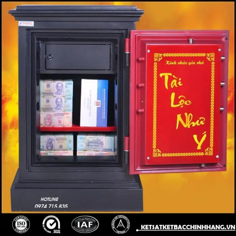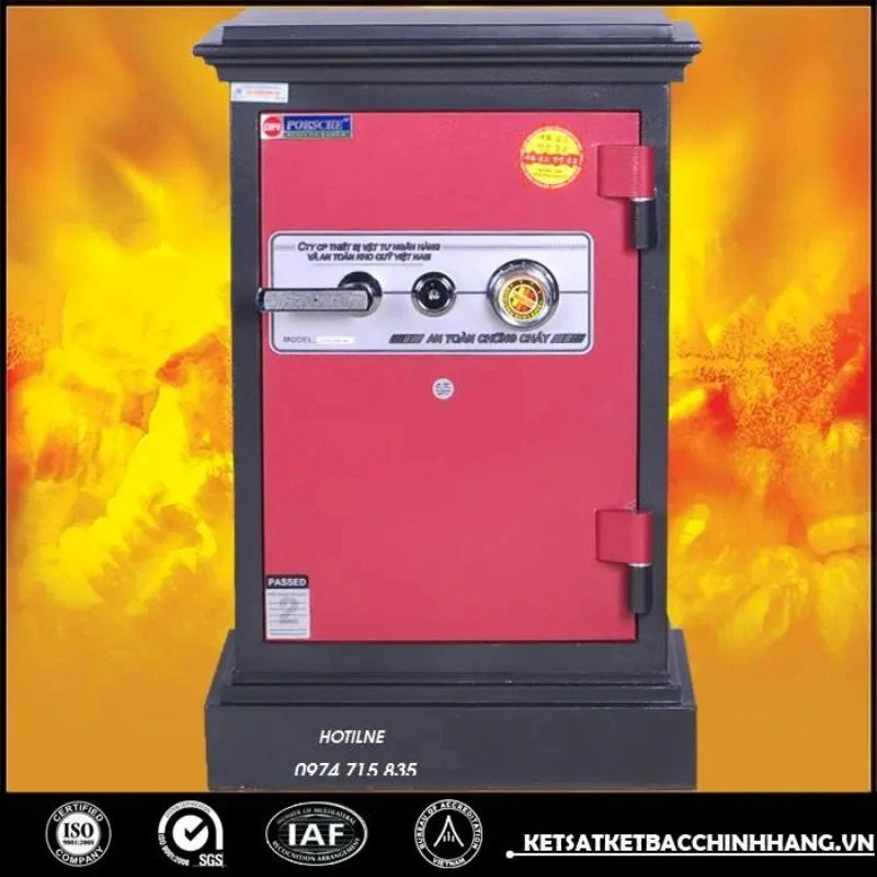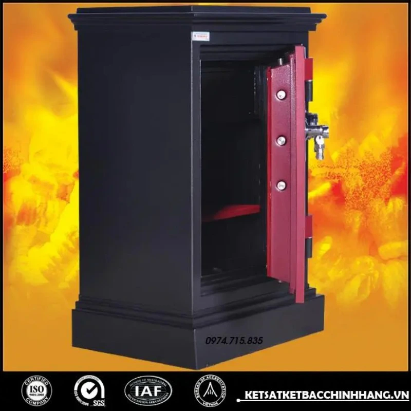 Tính năng: An toàn chống cháy, thân két đúc đặc 100%, hèm cửa dạng tam cấp giúp tăng khả năng chống cháy, chống phá, két có 8 chốt tự động ăn sâu vào trong lòng két.
