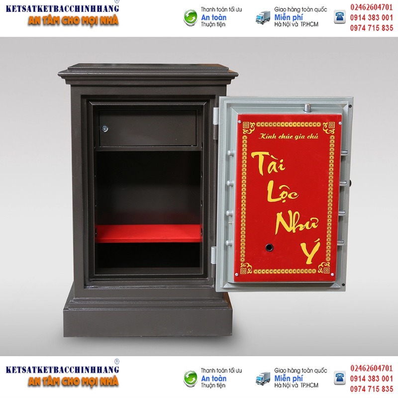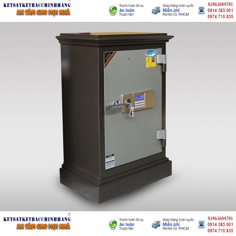 Thân két đúc đặc 100%, hèm cửa dạng bậc tam cấp tăng khả năng chống cháy, chống phá.2 bản lề ngoài, 04 chốt dẹt to an toàn trên cánh cửa tự động bật - ăn sâu vào thân két khi đóng cửa.