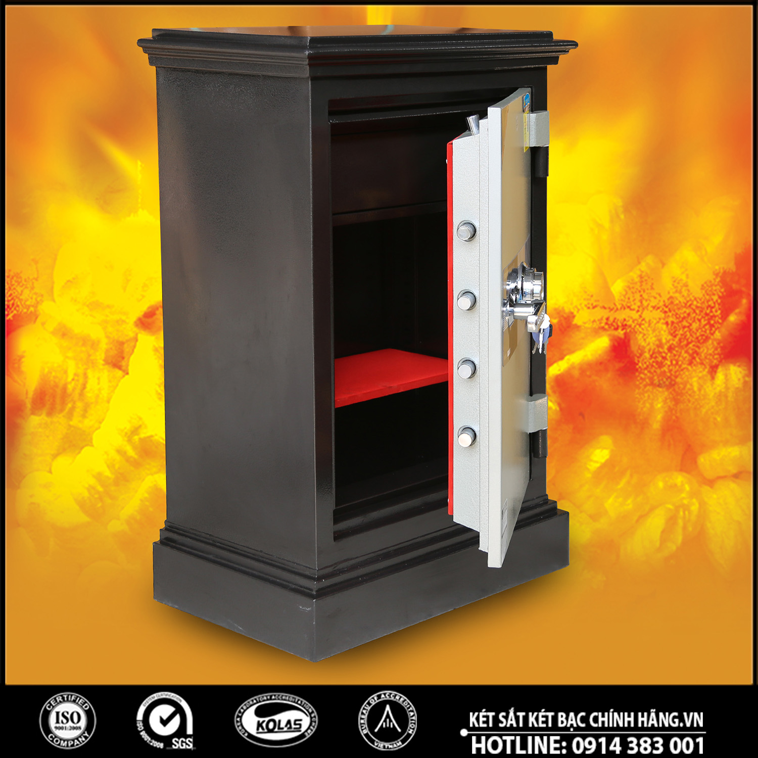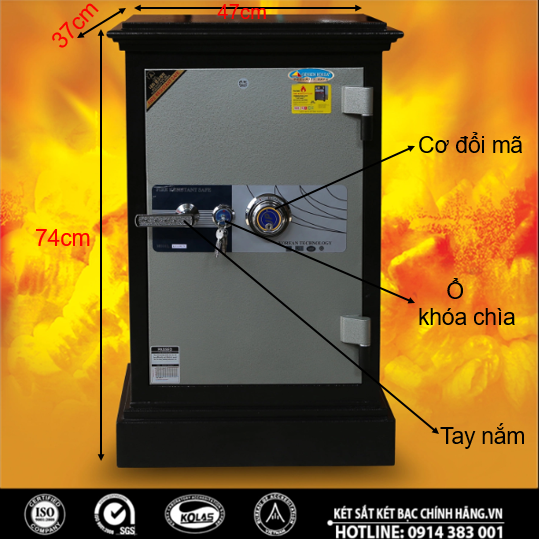 Tính năng: An toàn chống cháy, thân két đúc đặc 100%, hèm cửa dạng tam cấp giúp tăng khả năng chống cháy, chống phá, két có 8 chốt tự động ăn sâu vào trong lòng két.