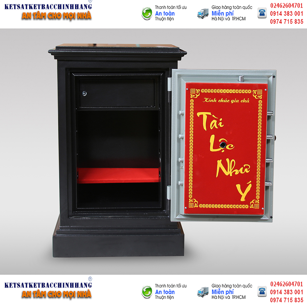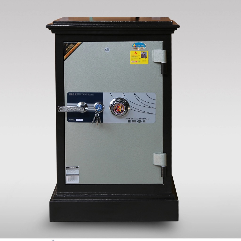 Thân két đúc đặc 100%, hèm cửa dạng bậc tam cấp tăng khả năng chống cháy, chống phá.2 bản lề ngoài, 04 chốt dẹt to an toàn trên cánh cửa tự động bật - ăn sâu vào thân két khi đóng cửa.