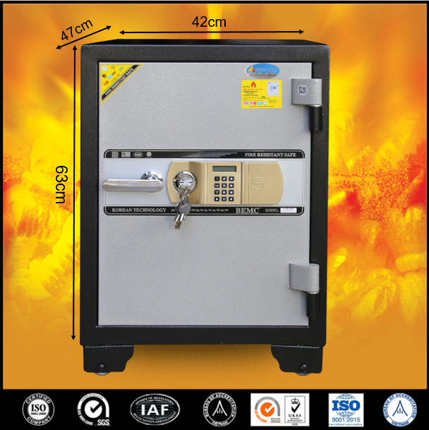 Tính năng: An toàn chống cháy, thân két đúc đặc 100%, hèm cửa dạng tam cấp giúp tăng khả năng chống cháy, chống phá. Két sắt có 6 chốt to tự động ăn sâu vào lòng két.
