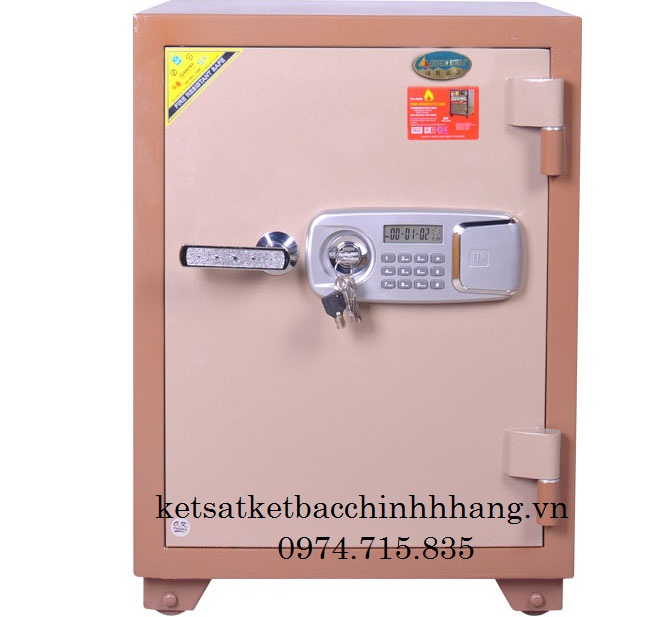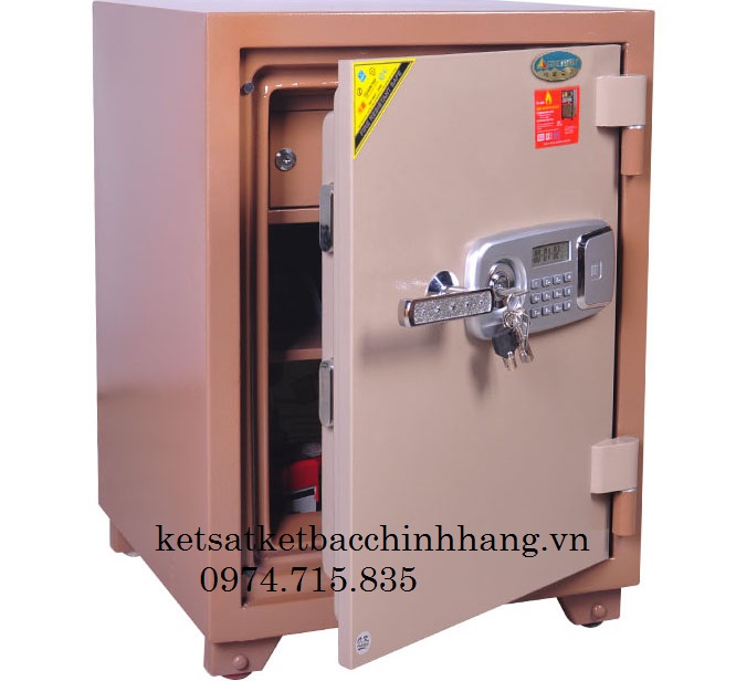Tính năng: An toàn chống cháy, thân két đúc đặc 100%, hèm cửa dạng tam cấp giúp tăng khả năng chống cháy, chống phá. Két sắt có 6 chốt to tự động ăn sâu vào lòng két.