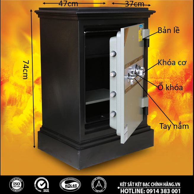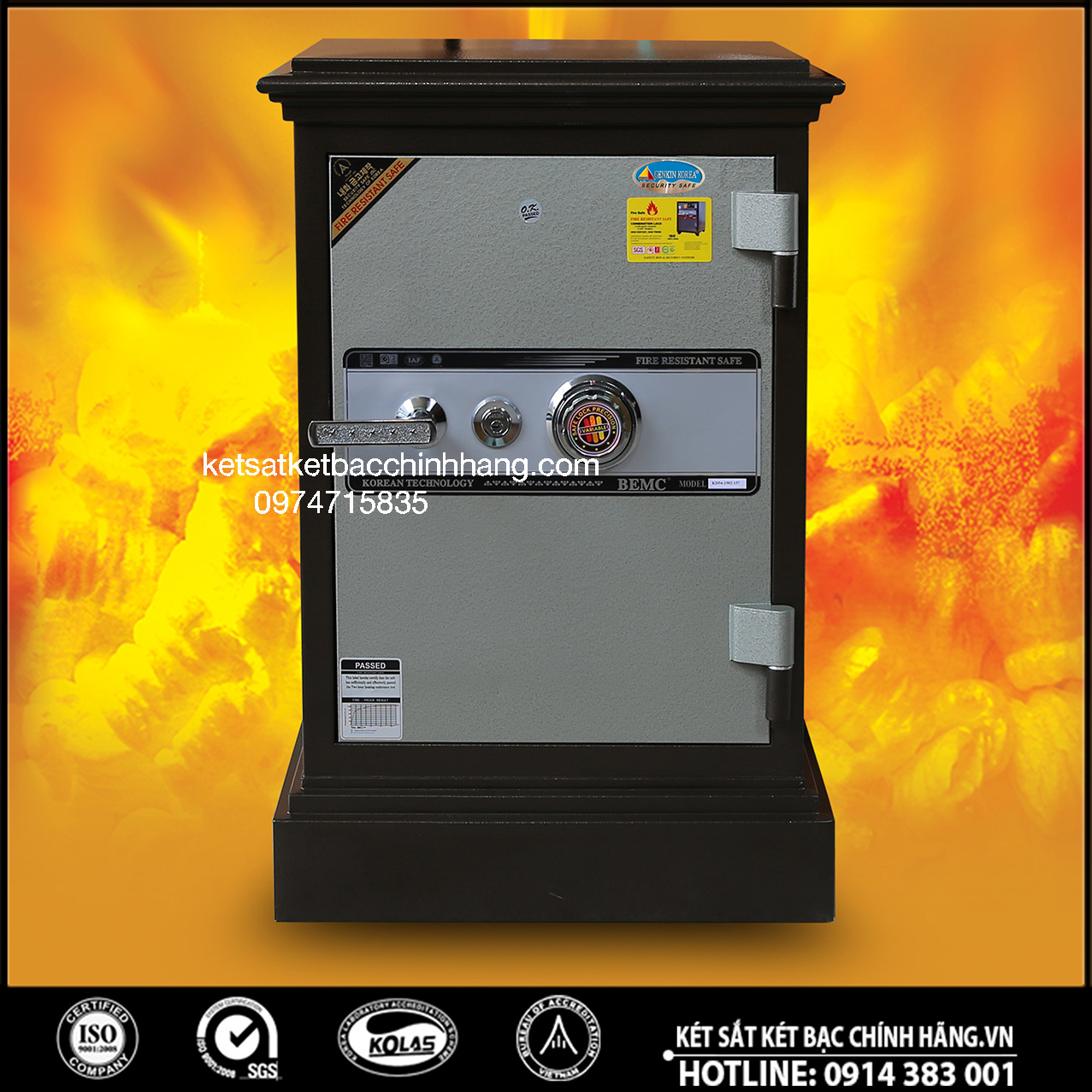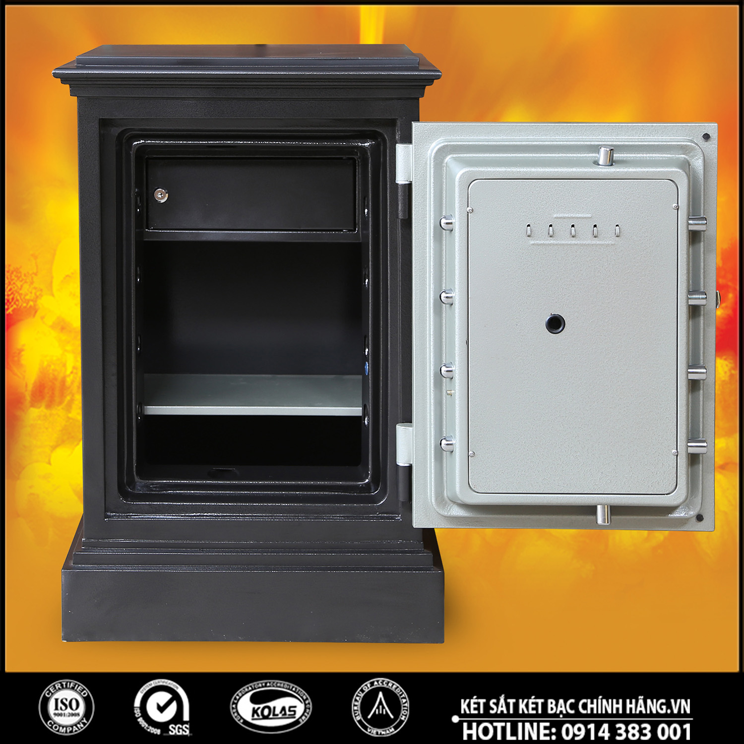 Tính năng: An toàn chống cháy, thân két đúc đặc 100%, hèm cửa dạng tam cấp giúp tăng khả năng chống cháy, chống phá, két có 8 chốt tự động ăn sâu vào trong lòng két.