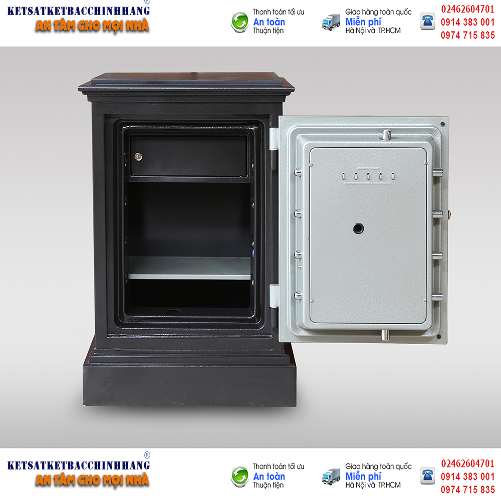 Tính năng: An toàn chống cháy, thân két đúc đặc 100%, hèm cửa dạng tam cấp giúp tăng khả năng chống cháy, chống phá, két có 8 chốt tự động ăn sâu vào trong lòng két.