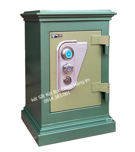 Két sắt an toàn KA54 : Két đứng có một khoá chìa, một khoá mã, một núm tay nắm.. Két sắt chống cháy mạnh mẽ với khả năng chịu nhiệt lên tới 500 độ c, két có khóa chìa và khóa mã ko đổi được số theo ý muốn, Phía dưới có bánh xe di động giúp di chuyển được dễ dàng.