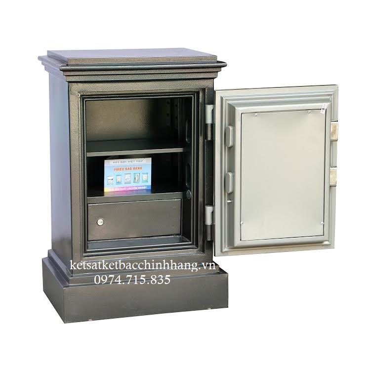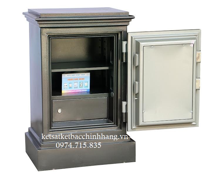 + Khoá cơ gồm: bộ mã số 4 số, khoá chìa 4 cạnh chống sao chép .Bản lề ngoài nên lòng két rất rộng. Tay lắm ngang hiện đại,dễ dàng thao tác mở két.Cánh có 4 chốt ẹt đúc an toàn. - Két sắt việt tiệp bản lề ngoài giup cho diện tích lọt lòng sử dụng bên trong được lớn hơn
