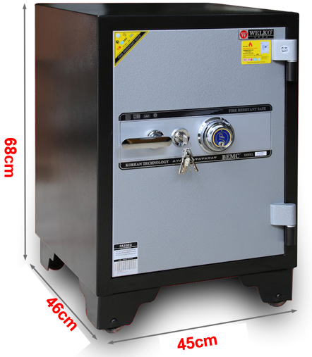 Tính năng: An toàn chống cháy, thân két đúc đặc 100%, hèm cửa dạng tam cấp giúp tăng khả năng chống cháy, chống phá. Két sắt có 6 chốt to tự động ăn sâu vào lòng két.