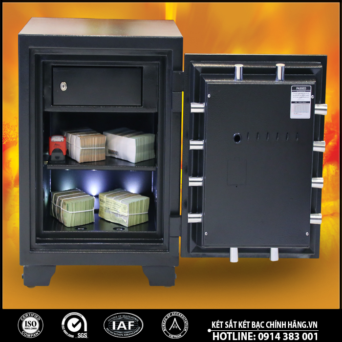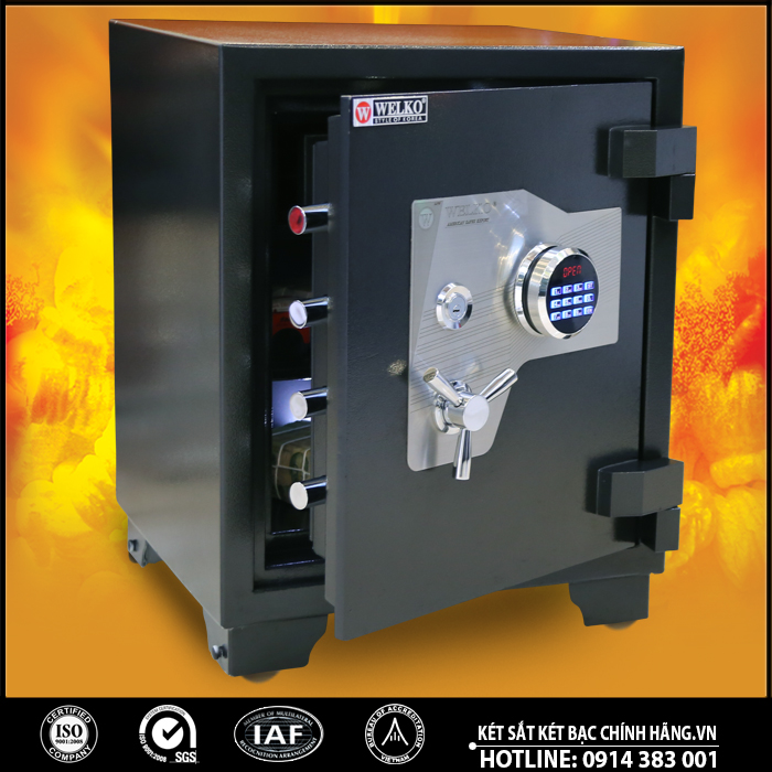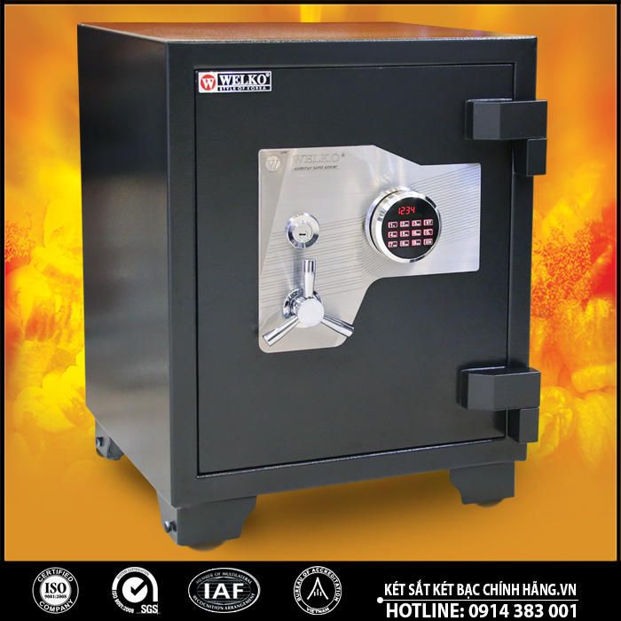 Két sắt WELKO US68DM Safes có khả năng chống lửa trong 1 giờ liên tục ở 2000 °C, đã được kiểm nghiệm và cấp giấy chứng nhận quốc tế UL và ETL